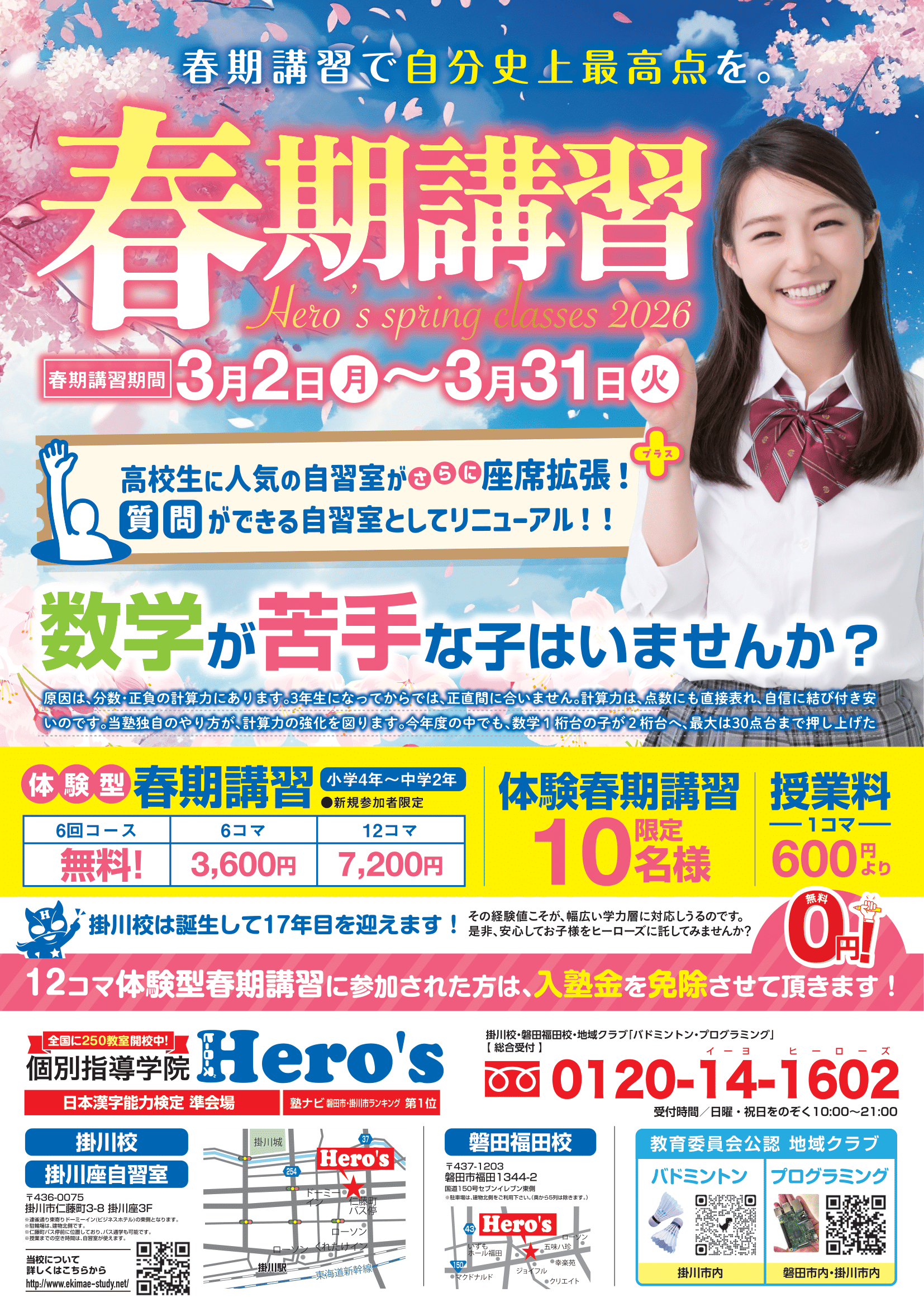 はじめまして。個別指導学院 ヒーローズ 掛川校・磐田福田校・掛川座自習室へようこそ。